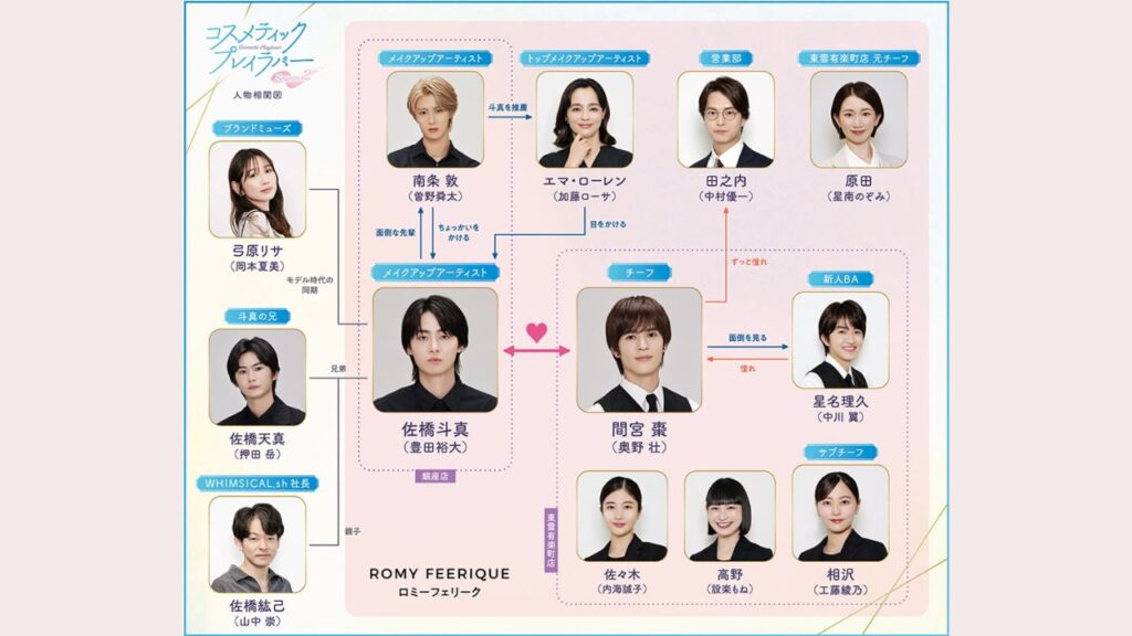 対する佐橋斗真は、クールな実力派メイクアップアーティストであり、間宮棗を溺愛する一方で、自身のキャリアアップのために高い志を持っています。